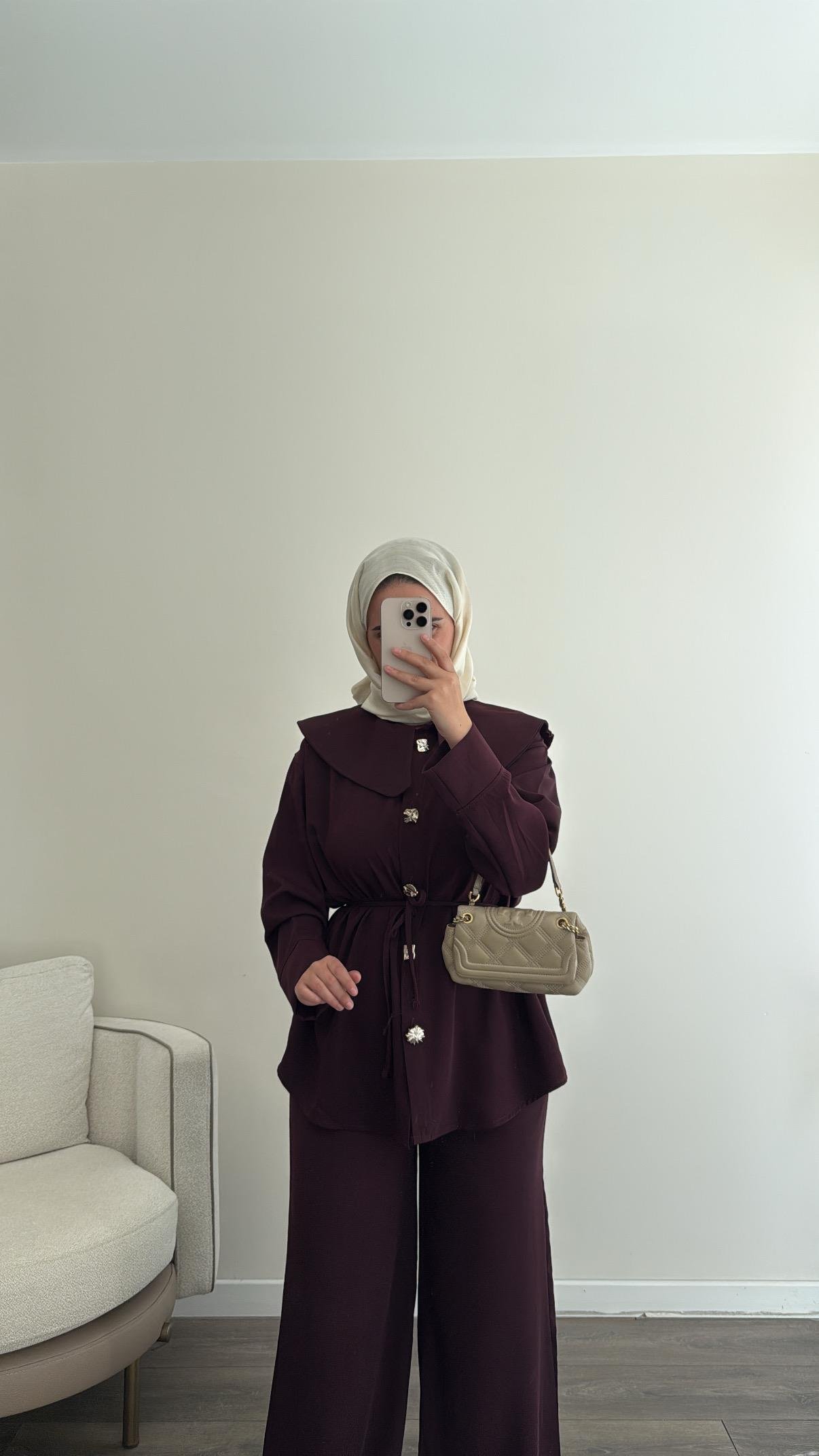 Düğme Ve Yaka Detaylı Bordo Pantolonlu Takım