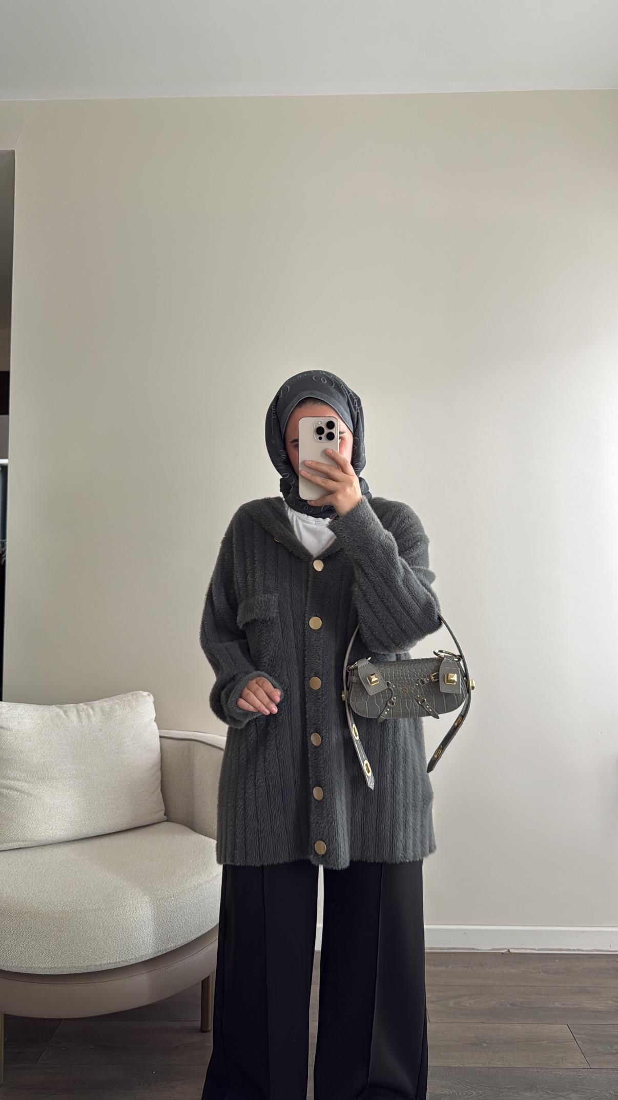 Kapüşonlu Çizgili Yumoş Hırka- Füme