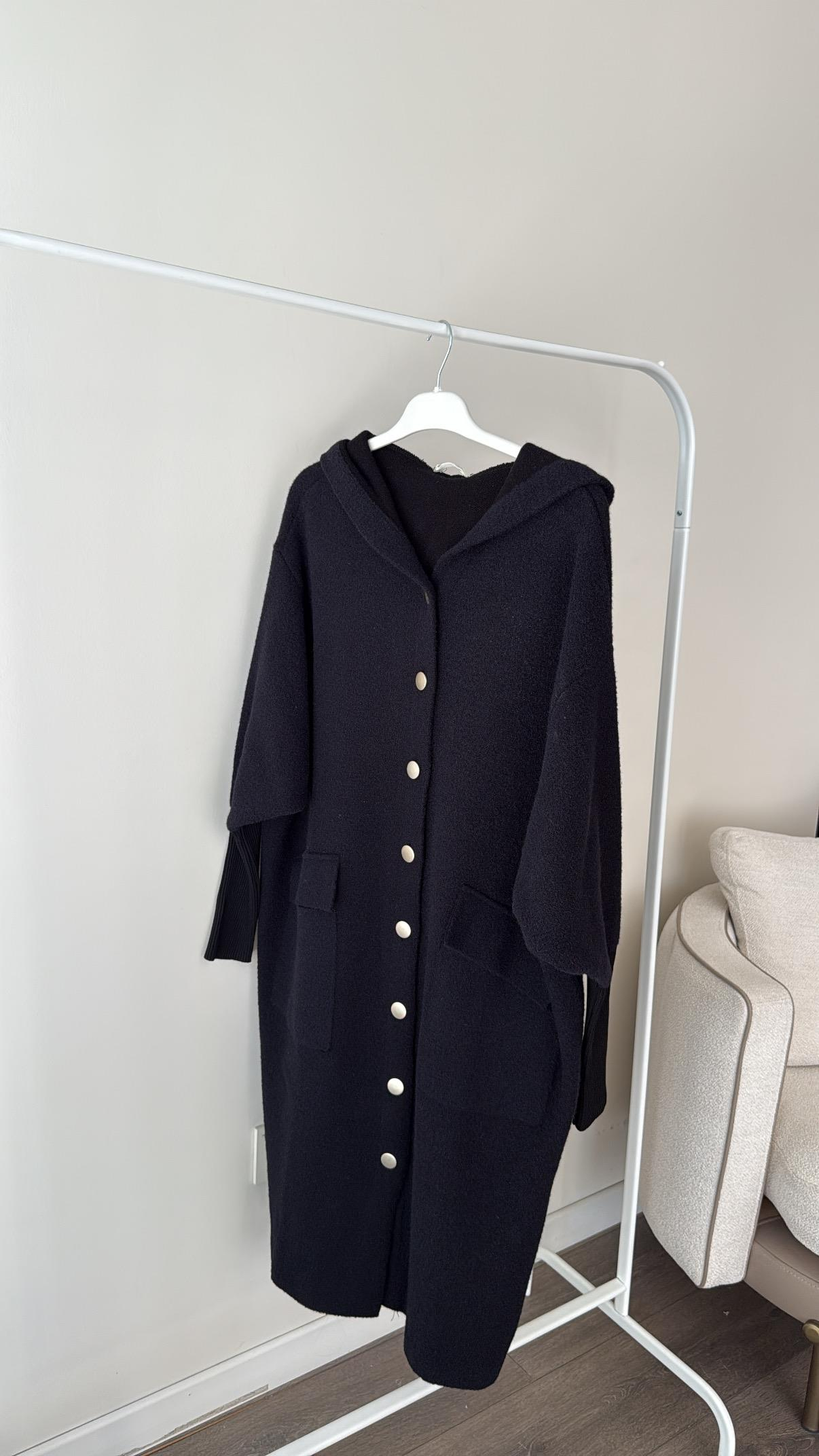 Kapüşonlu Uzun Triko Hırka - Siyah